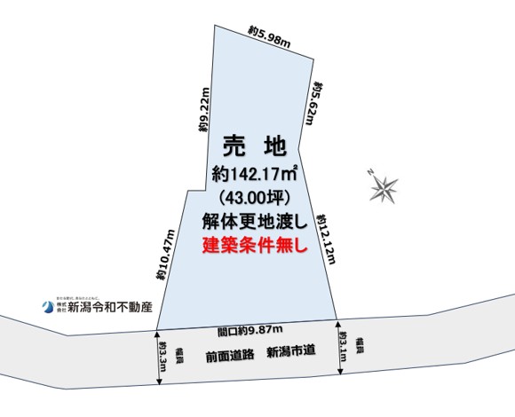 【亀田小4分・駅12分】約43坪・解体更地渡し・確定測量済!初期費用を抑えすぐ建築可能。前面は市道で道路負担なし。利便性と安心を兼ね備えた江南区東本町の売地です! ☆おススメpoint☆「亀田小まで徒歩約4分!低学年のお子様がいるご家庭も安心の距離です。更地&測量後のお渡しなので、余計な手間やコストをかけずに家づくりに集中できちゃいます!この利便性、ぜひ現地で体感してほしいです!」 【亀田小学校まで徒歩4分(270m)】お子様の毎日の通学も安心な、子育て世代にぴったりの住環境!亀田駅へも徒歩12分で、通勤やお出かけにも便利な江南区東本町5丁目の売地(約43坪)です。 当物件は、買主様に嬉しい「解体更地渡し」「確定測量実施」でのお引渡し。解体費用の負担や境界トラブルの心配がなく、余計なコストを抑えてスムーズに理想のマイホーム建築をスタートできます。 前面道路は新潟市道で道路負担も一切ありません。亀田中学校も徒歩13分(1000m)と教育施設がバランス良く揃う好立地で、新しい家族の暮らしを始めませんか?